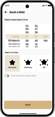 Hurry up the booking process allowing the user to book a ride in a matter of seconds. The layout helps to take quick actions, intelligent recommendations, and a reservation system that is natural and easy to use.